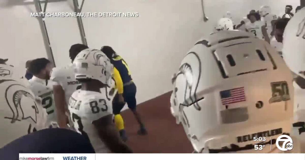 Michigan running back Blake Corum 2 escapes Michigan State safety Angelo Grose 15 in the first half of an NCAA college football game in Ann Arbor Mich Saturday Oct. Jim Harbaugh expects the four suspended Michigan State football players involved in roughing up two. On Monday ESPN released its own footage from the tunnel which showed from a distance how the incident seemed to develop along with a helmet being swung by a Michigan.